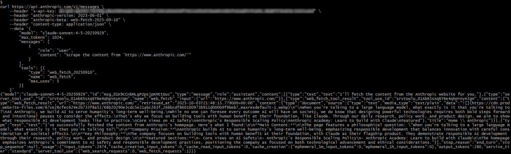 Substitua o espaço reservado <YOUR_ANTHROPIC_API_KEY> por sua chave real da API do Anthropic. Em seguida, execute a solicitação e você deverá obter algo parecido com isto: