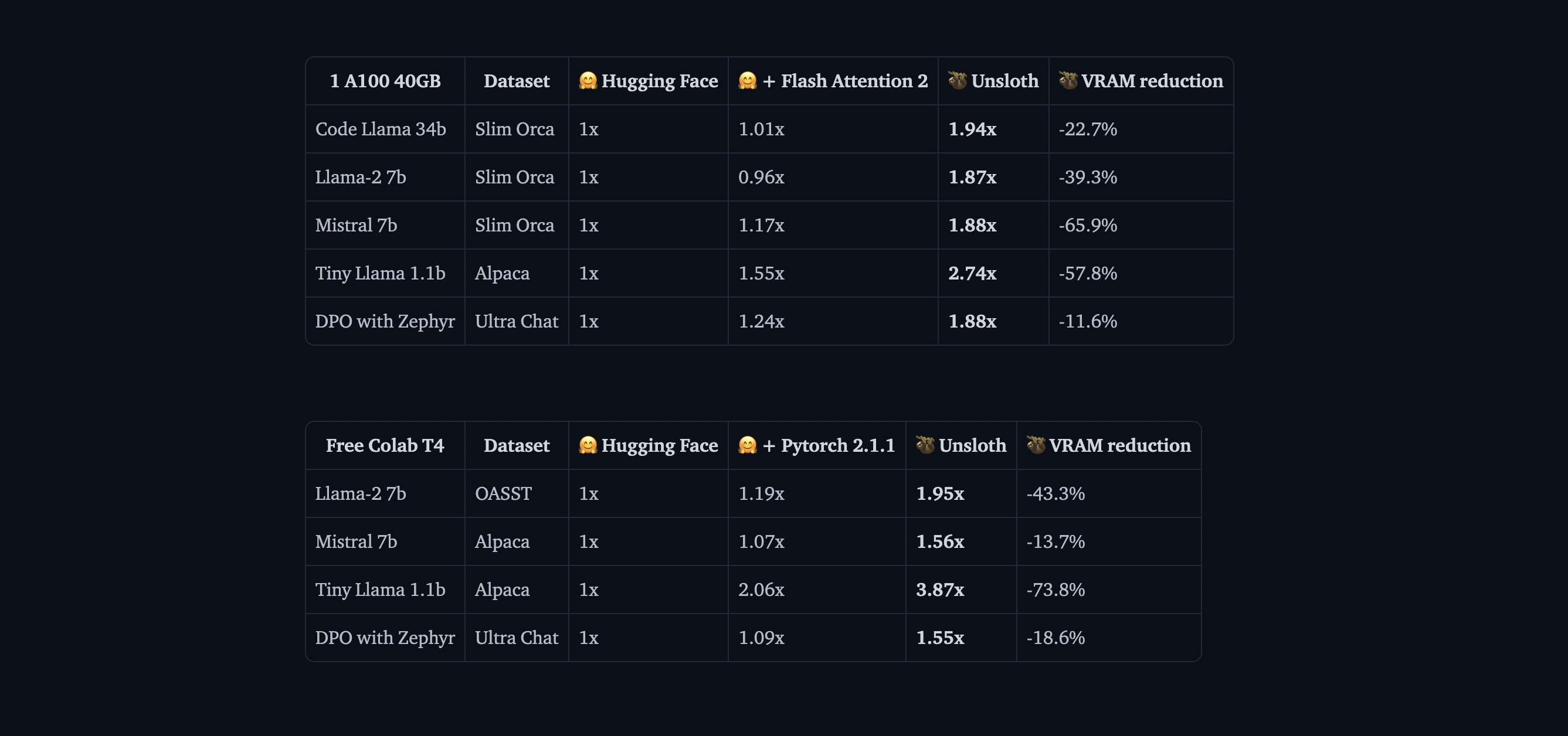 Unsloth é uma biblioteca leve que torna o ajuste fino do LLM significativamente mais rápido e, ao mesmo tempo, é totalmente compatível com o ecossistema Hugging Face (Hub, transformadores, PEFT, TRL). A biblioteca é compatível com a maioria das GPUs NVIDIA, desde a GTX 1070 até as H100s, e funciona perfeitamente com todo o conjunto de treinadores da biblioteca TRL.