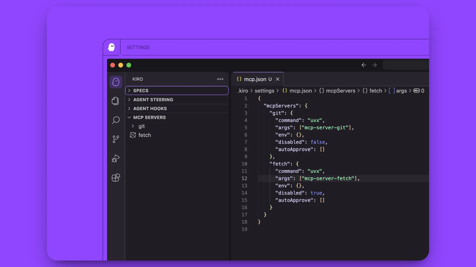 Na barra lateral esquerda, navegue até a guia Kiro. Você verá quatro seções: