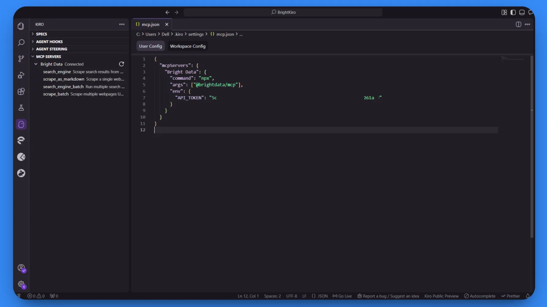 Nesta seção guiada, você aprenderá a instalar e configurar o Kiro com o servidor Web MCP da Bright Data. O resultado final será um ambiente de desenvolvimento de IA capaz de acessar e processar dados da Web em tempo real diretamente no seu fluxo de trabalho de codificação.