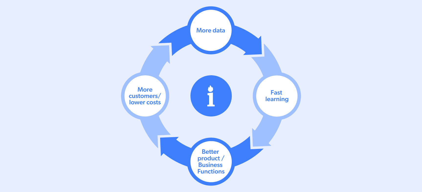 Primeiro, um flywheel de dados eficaz pode aumentar as receitas, fornecendo dados para melhorar continuamente os produtos e serviços, o que, por sua vez, pode levar à geração de mais clientes. Isso é conhecido como um “ciclo virtuoso”: mais dados, aprendizado mais rápido, produtos melhores, mais clientes. Repita o processo.