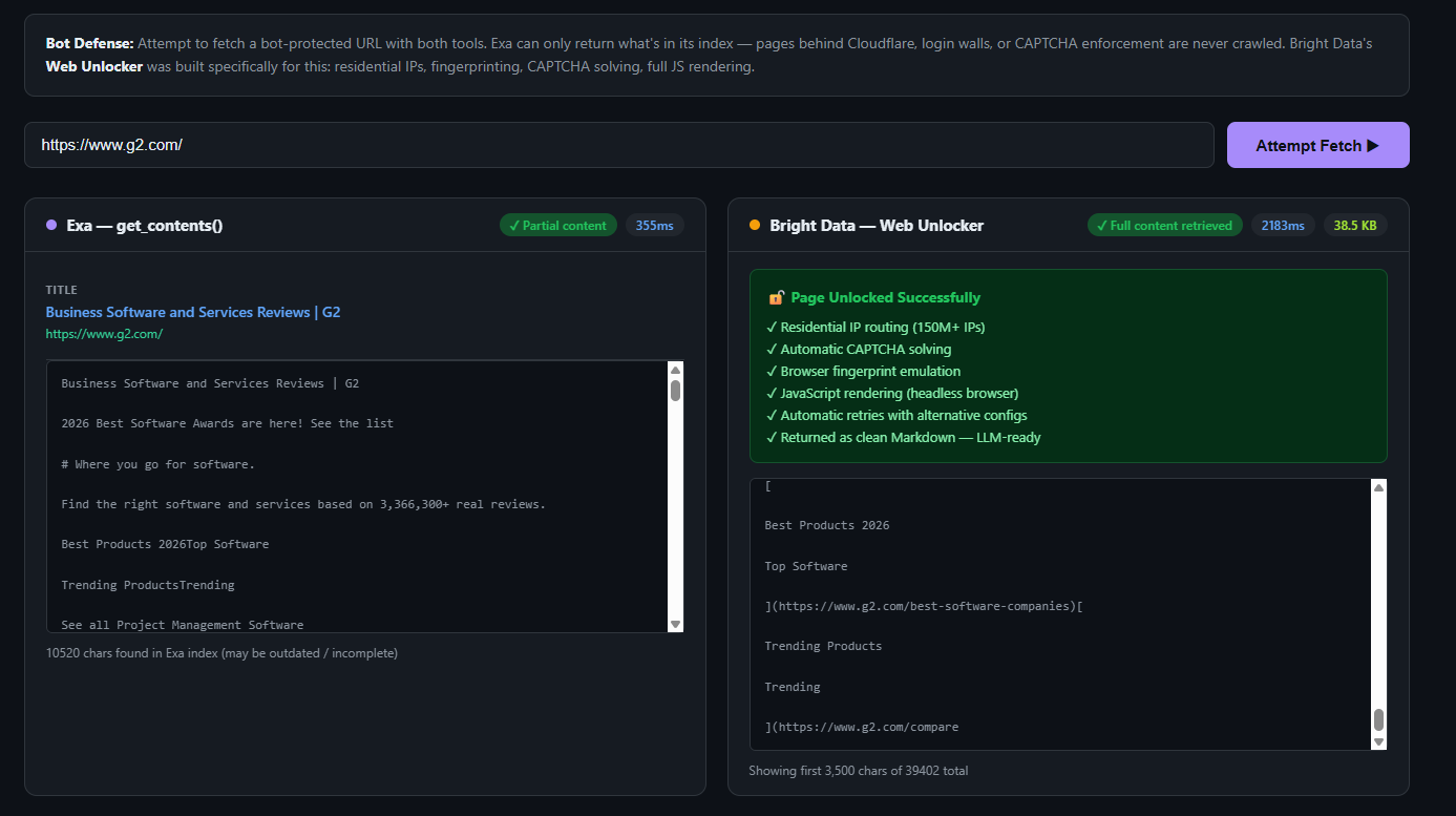 de pesquisado Exa é de 10 QPS. A Bright Data não tem limite de solicitações simultâneas. - O Bright Data Web Unlocker pode rastrear páginas protegidas contra bots. O Exa não pode.