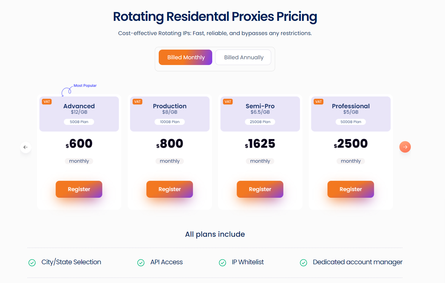 O serviço fica mais barato à medida que você aumenta a escala. Por exemplo, para Proxies residenciais rotativos, as taxas caem para US$ 4/GB para 1 TB de dados. Quanto aos Proxies residenciais estáticos, as taxas caem para US$ 5/GB para o plano de 1 TB.