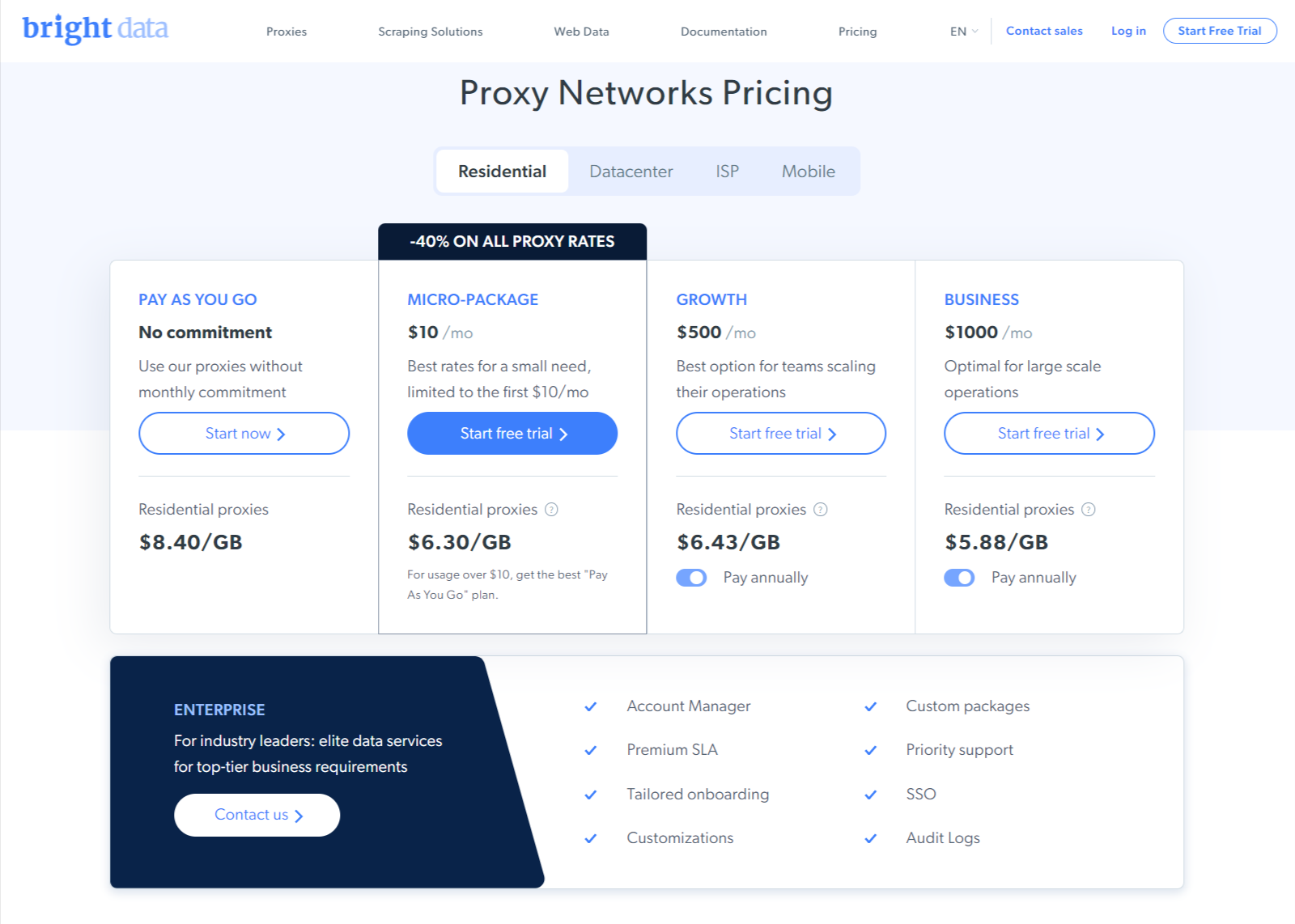 A Bright Data, por outro lado, oferece uma grande flexibilidade. A maioria dos nossos planos é pré-paga. Você só precisa se comprometer se estiver aumentando a escala e optando por um plano maior. A tarifa da Bright Data começa com um plano pré-pago sem compromisso, cobrando US$ 8,4 por GB de tráfego. Além disso, há um microplano que cobra apenas US$ 10 por mês ou US$ 5,04/GB. Há também a opção de optar por nossa avaliação gratuita.
