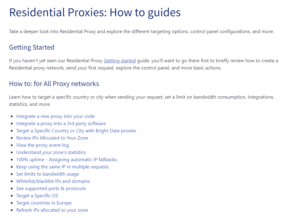 A Bright Data, em comparação, fornece documentação extensa, masterclass de dados da web, vídeos, blogs, webinars, trechos de código para várias linguagens de programação e muitas predefinições para ajudar os usuários que são desenvolvedores. As informações no site da Bright Data são, na verdade, mais do que suficientes.