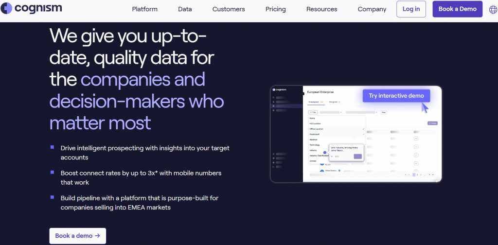 O Cognism é uma solução de dados B2B com total conformidade com o GDPR que opera como uma plataforma SaaS. Ele se destaca por fornecer inteligência acionável por meio de alertas em tempo real sobre os principais acionadores de vendas, como tendências de contratação e mudanças de emprego. Os principais recursos incluem a criação de personas granulares para pesquisas direcionadas e uma extensão de navegador que se integra diretamente ao LinkedIn e a CMRs populares.