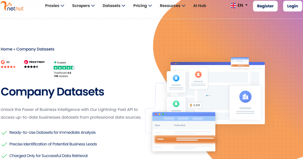 | NetNut | Poucos | API de extração de dados B2B | JSON, CSV | ISO 27001, GDPR | Suporte 24 horas por dia, 7 dias por semana | ✔️ |