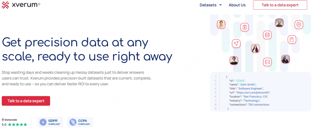 A Xverum fornece conjuntos de dados B2B prontos para uso que são pré-processados e enriquecidos, poupando-o da limpeza manual de dados. Um recurso importante é a inclusão de registros de POI, acrescentando uma camada de inteligência de localização aos dados em conformidade com o GDPR e a CCPA.