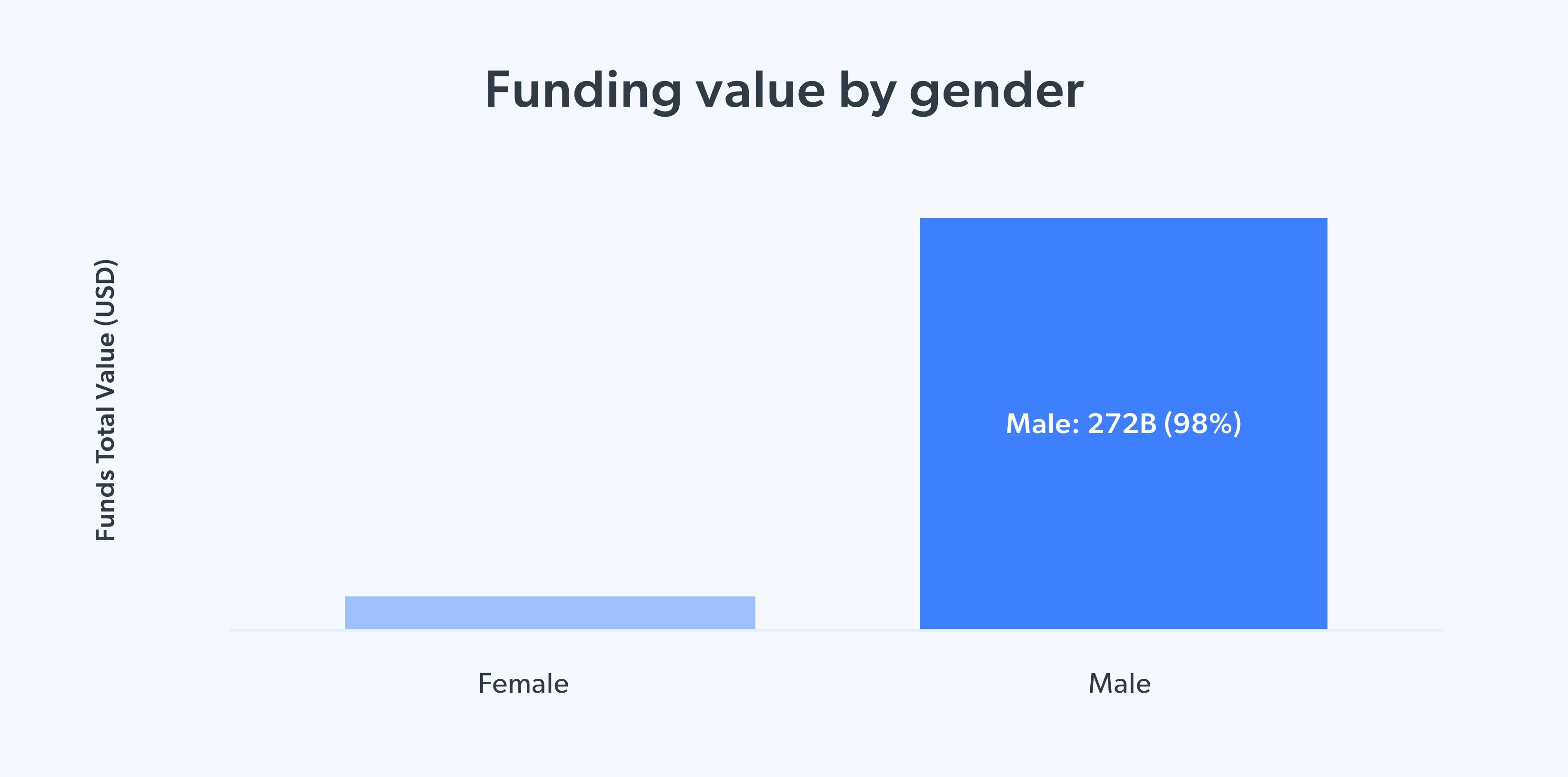 Nossa pesquisa mostra que o financiamento para fundadoras é muito menor do que o de seus colegas homens. Estamos falando de 98% menos financiamento. É tão chocantemente baixo que você terá dificuldade em ver as estatísticas no gráfico de barras!
