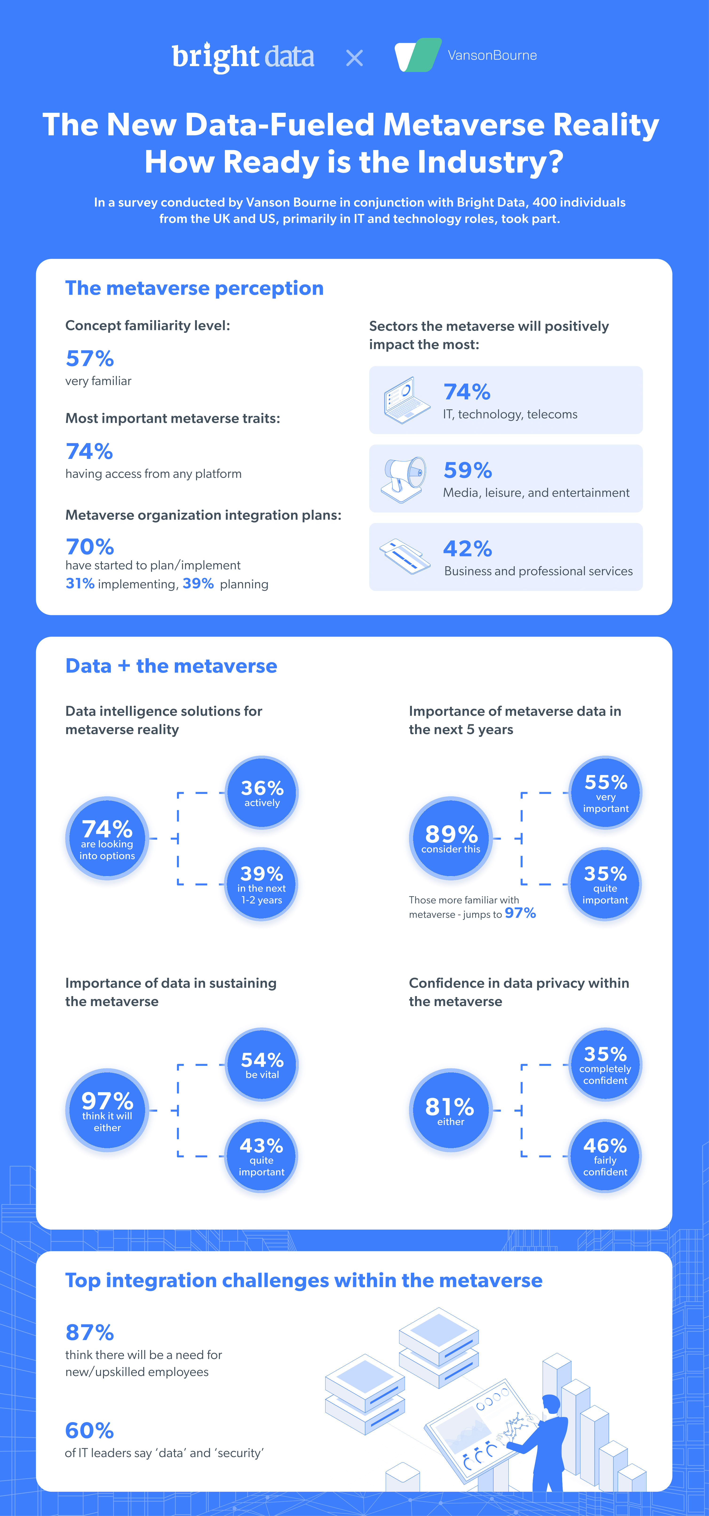 - 60% dos entrevistados identificaram os dados e a segurança como uma barreira significativa que impede sua integração com o metaverso.