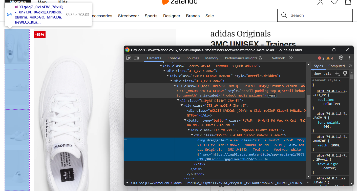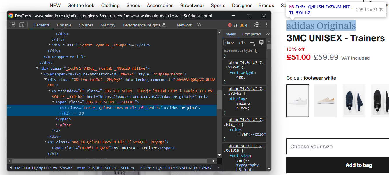 Para entender qual das muitas ferramentas de scraping disponíveis é a melhor para fazer scraping no Zalando, abra-o no seu navegador. Inspecione o DOM e compare-o com o código-fonte bruto. Você notará que a estrutura do DOM é ligeiramente diferente do documento HTML produzido pelo servidor. Isso significa que o site depende do JavaScript para renderização. Para fazer scraping em um site de conteúdo dinâmico, você precisa de uma ferramenta que possa executar JavaScript, como o Selenium!