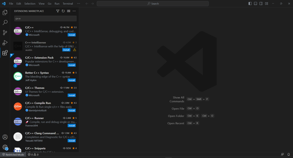 Clique no botão “Install” (instalar) no primeiro elemento para adicionar a funcionalidade de desenvolvimento de C++ ao VS Code. Aguarde a configuração da extensão e abra a pasta c++-web-scraper com “``File``” > “``Open Folder... ``”(arquivo > abrir pasta…).