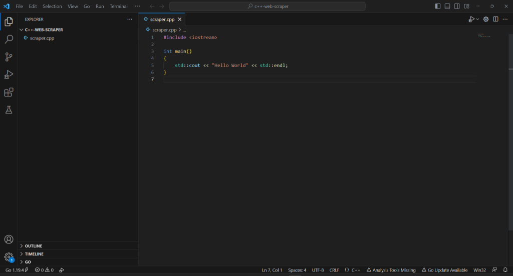 Clique com o botão direito na seção “EXPLORER” (explorador), selecione “New File…” (novo arquivo) e inicialize um arquivo scraper.cpp da seguinte forma: