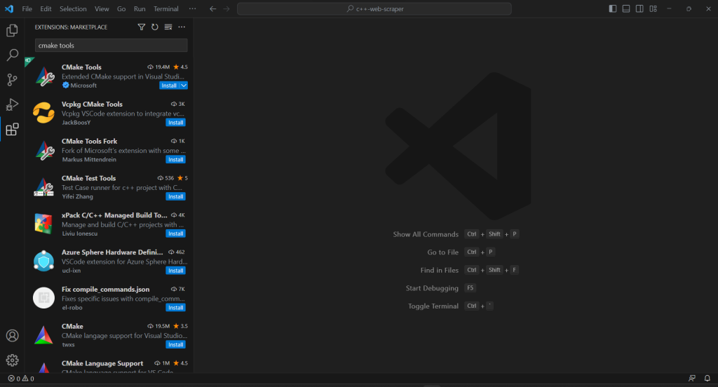 Para criar o script de scraping em C++ e concluir o processo de inicialização do projeto, você precisará adicionar a extensão CMake Tools ao VS Code: