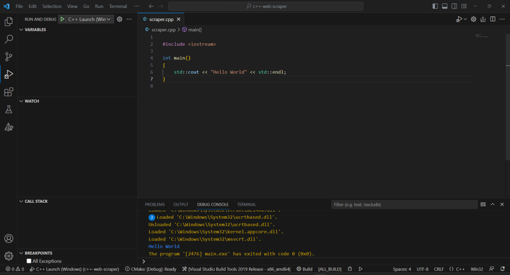 Reinicie o VS Code e então você poderá importar qualquer biblioteca instalada com #include. Então, adicione as três linhas a seguir no topo do seu arquivo scraper.cpp :