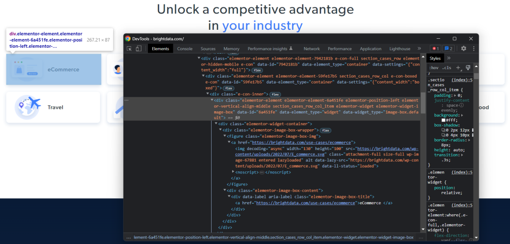 Para definir uma estratégia eficaz de seleção de XPath para os nós HTML de interesse, você precisa analisar o DOM da página de destino. Abra a página inicial da Bright Data no navegador, clique com o botão direito em um dos cartões de setor e escolha “Inspecionar”. Isso abrirá a seção DevTools: