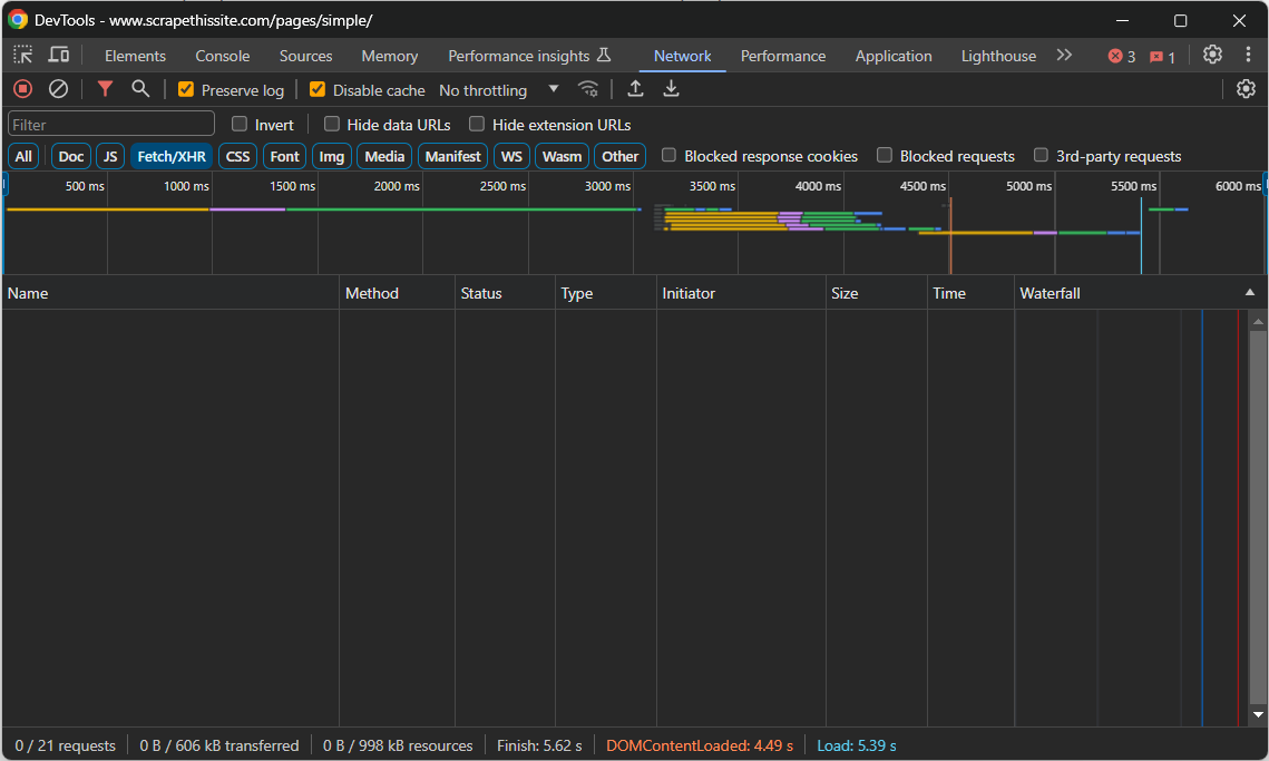 Enquanto a página estiver carregando e sendo renderizada, essa seção permanecerá vazia. Isso significa que a página da web não faz nenhuma solicitação AJAX. Em outras palavras, ela não recupera dados dinamicamente no cliente via JavaScript. Portanto, é uma página de conteúdo estático, cujo documento HTML já contém todos os dados de interesse.