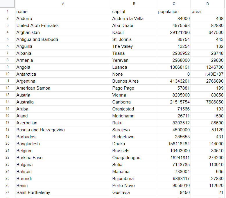 Como você pode ver, ela contém uma lista de todos os países do mundo e algumas informações interessantes sobre eles.