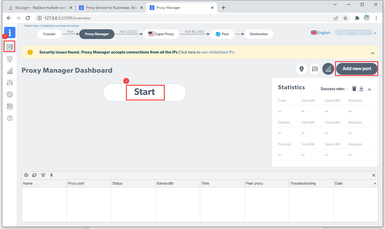 A interface de gerenciamento http://127.0.0.1:22999/ será aberta automaticamente. Clique em “Iniciar” ou “Adicionar nova porta” para criar uma porta de Proxy.