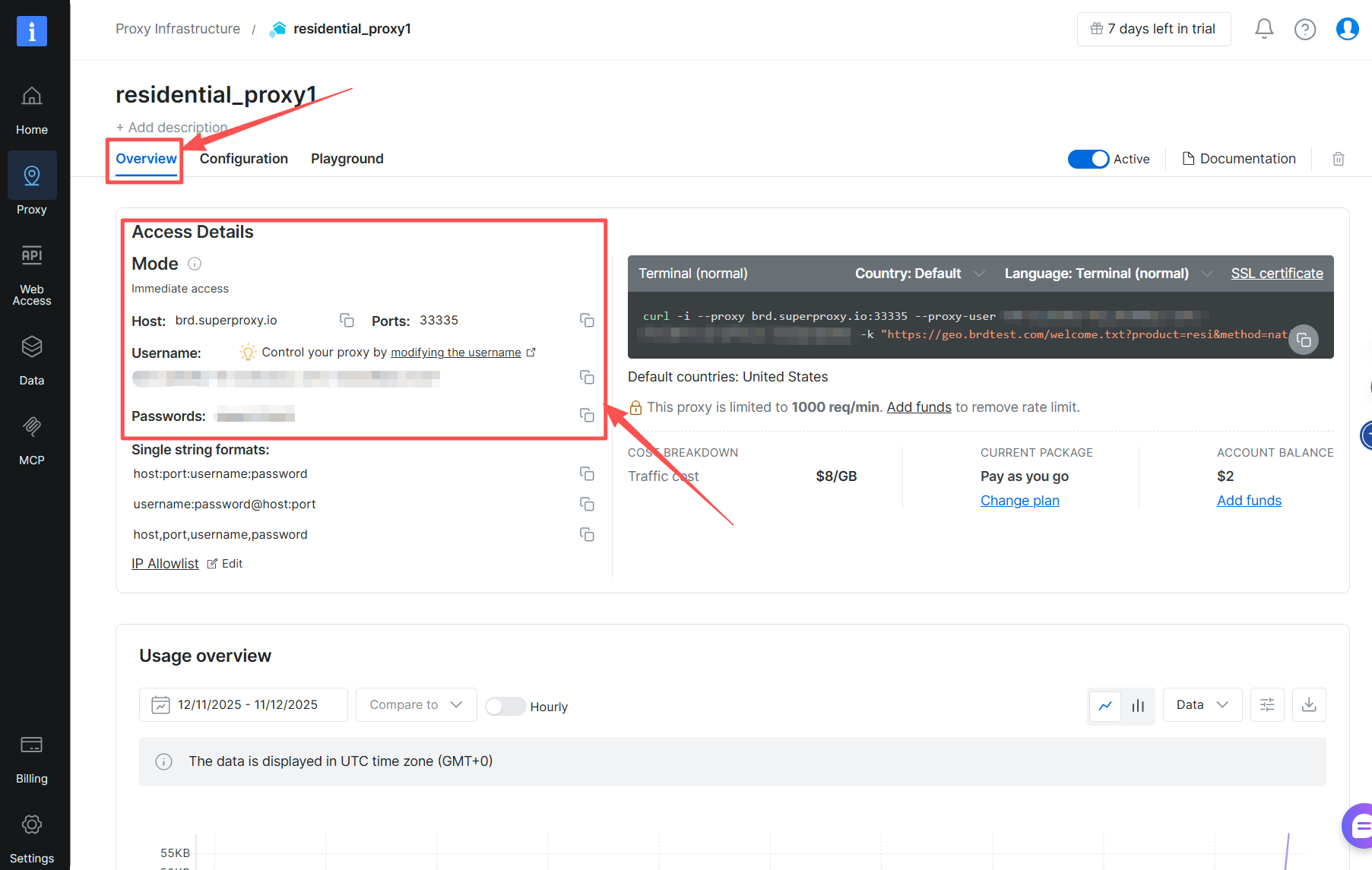 Vá para Bright Data e escolha a seção “Proxy”. Vá para “Infraestrutura de proxy” e selecione a zona de proxy que você está usando. Clique na opção “Visão geral” e depois em “Detalhes de acesso” para copiar o nome de usuário e a senha fornecidos.
