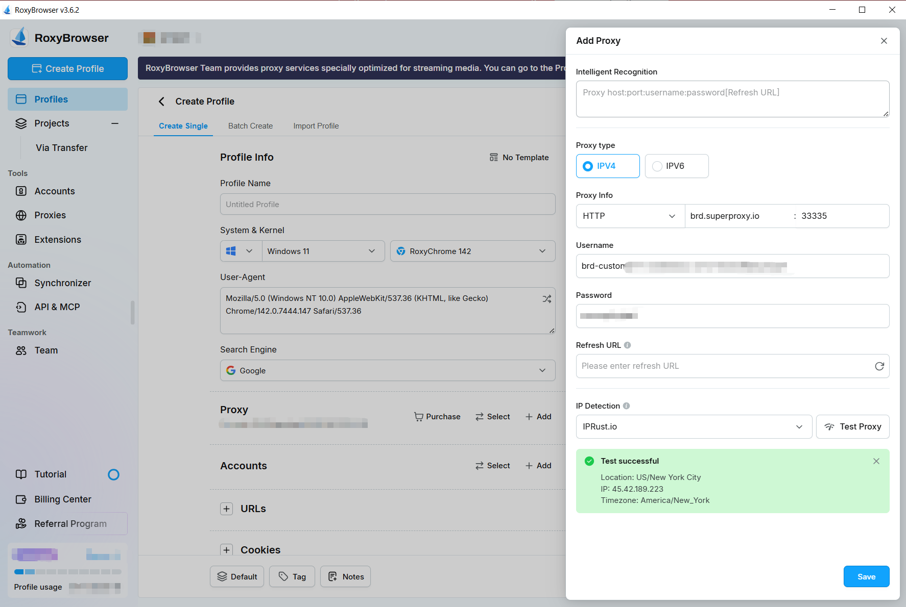 Clique no botão “Testar Proxy” e certifique-se de que a mensagem “Teste bem-sucedido” seja exibida. Clique em “Salvar” para salvar o perfil do navegador.